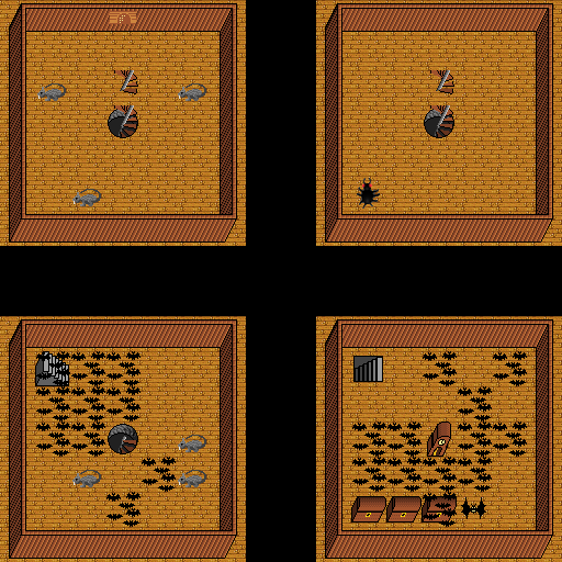 Monsters on map (level from 1 to 5): bat, giant bat, mouse, spider.