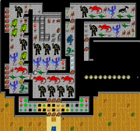 Monsters on map (level from 4 to 100): acid sphere, basilisk, black pudding, chinese dragon, dragon, electric dragon, gaelotroll, golem of Necromancer, green slime, hill giant, ice para-elemental, lightning para-elemental, ogre, pet of Necromancer, rustmonster, Smith, troll, wyvern.