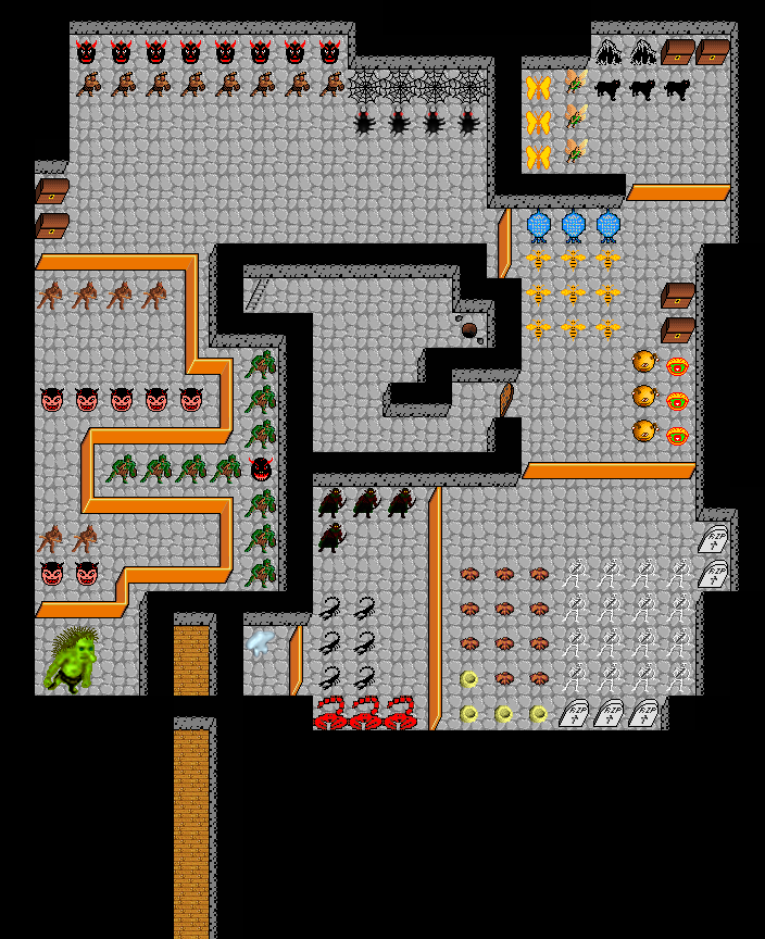 Monsters on map (level from 1 to 12): beholder, bird, dark elf, gnoll, goblin, ice para-elemental, killer bee, orc, panther, pixie, scorpion, skeleton, spider, troll.